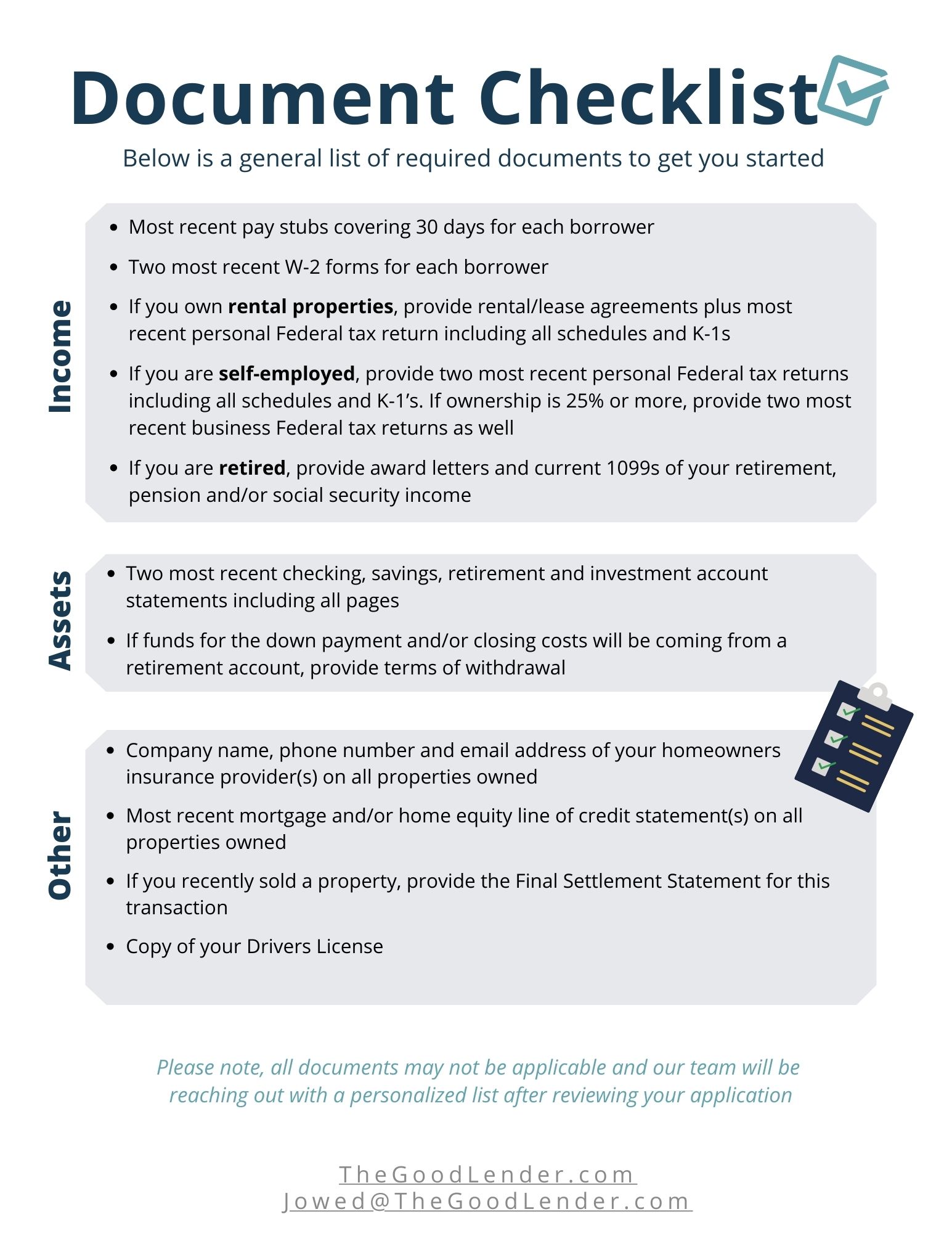 This detailed image showcases a comprehensive checklist of documents needed for a home loan application, including sections for verifying income, assets, and other critical information. Designed to guide applicants through the preparation process, it ensures no essential paperwork is overlooked. From W-2s and bank statements to credit reports and more, this visual aid is the key to a streamlined and successful mortgage application process.